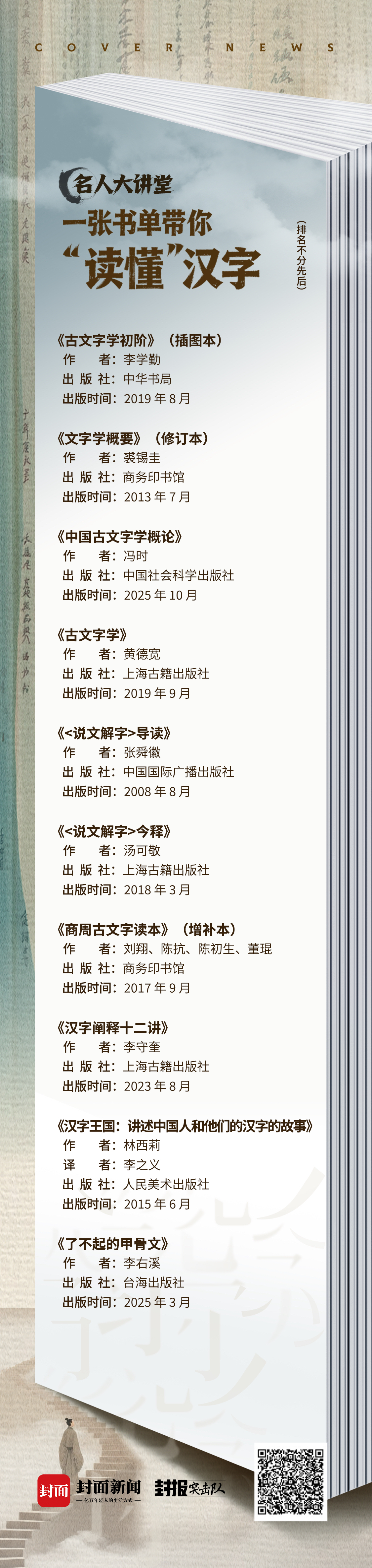 名人大讲堂“汉字源流”季,从汉字入门到精解,从通识到专业,经由大讲堂嘉宾推荐,我们甄选十部著作:搭建知识骨架,有《古文字学初阶》《文字学概要》《中国古文字学概论》《古文字学》等权威作品;学习《说文》,有《〈说文解字〉导读》指引门径,也有《〈说文解字〉今释》提供现代化的精准解读;有学术,也要考虑实用。《商周古文字读本》提供了亲手解读甲骨金文的珍贵实训,《汉字阐释十二讲》则传授科学解读汉字形音义与文化内涵的思维方法;书单亦注重多元视角与可读性。《汉字王国》以外国学者的眼光,生动揭示汉字日常性与文化性,《了不起的甲骨文》则用鲜活的叙事,让古老的甲骨文重现于生动的商代场景。